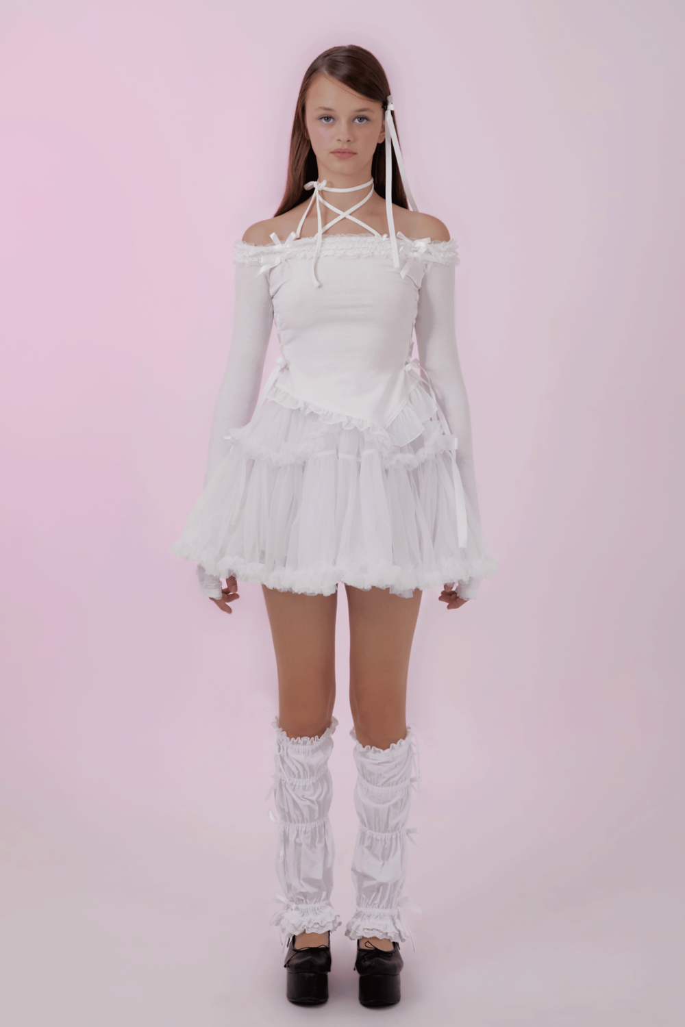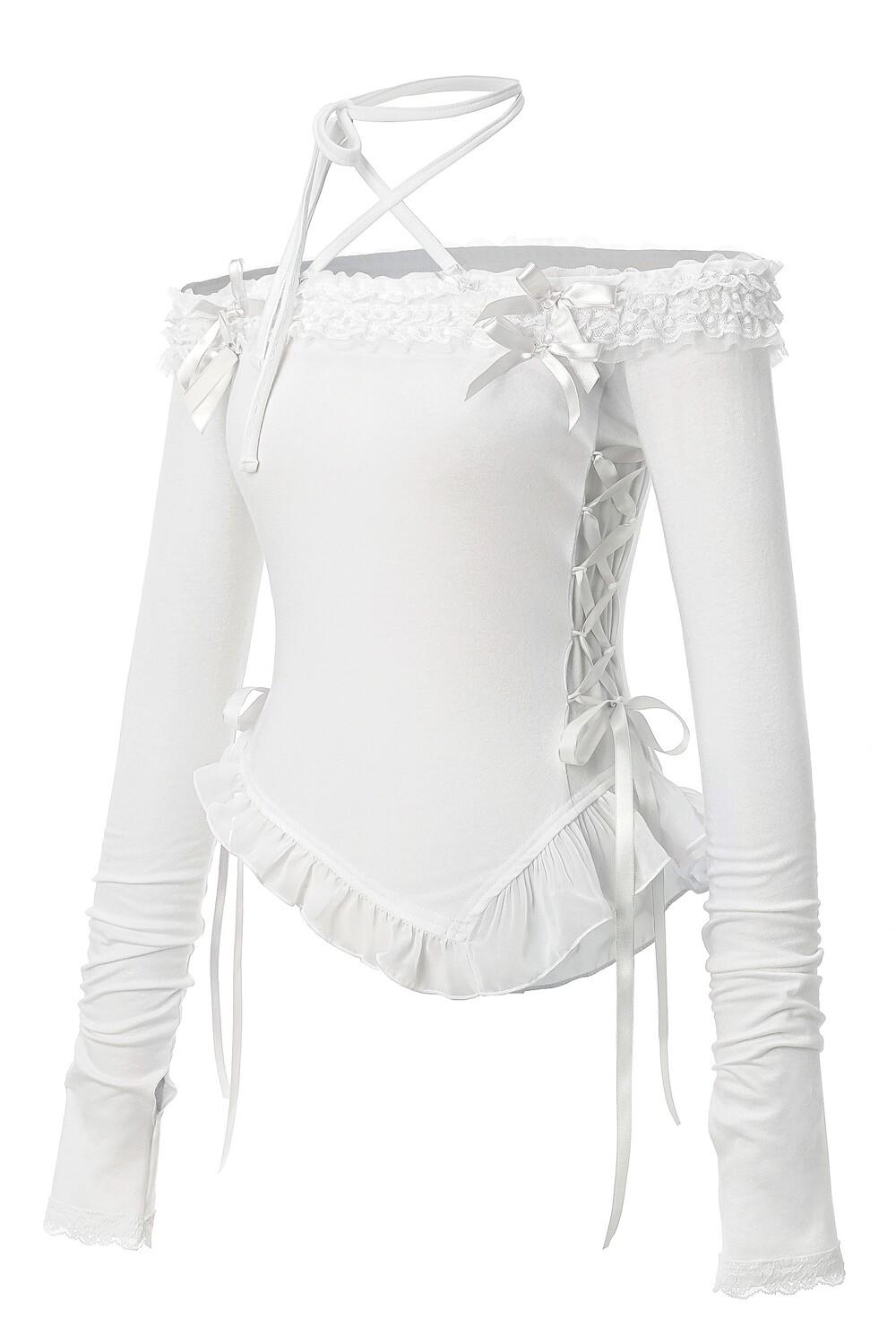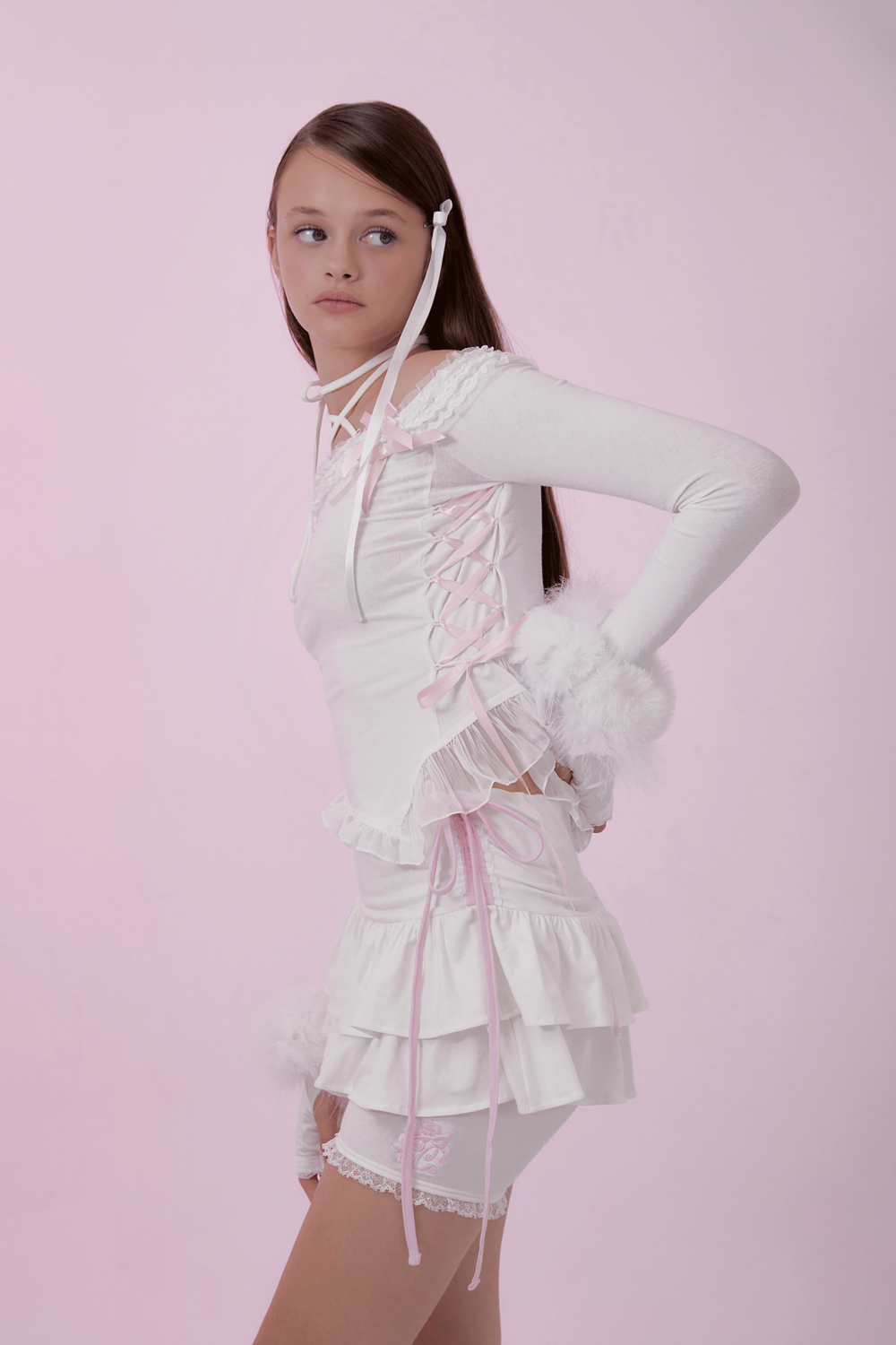 Laced up off-shoulder top decorated with white lace on shoulder line. Two small ribbons and four large satin ribbons on top of the lace add full of sweetness. It has a long neck strap, so you can wear it as an x-strap or a halter style. The lace-up ribbon on the waist is adjustable. The sleeves are length that covers the back of the hand, and there is a finger hole so you can wear it like a warmer.