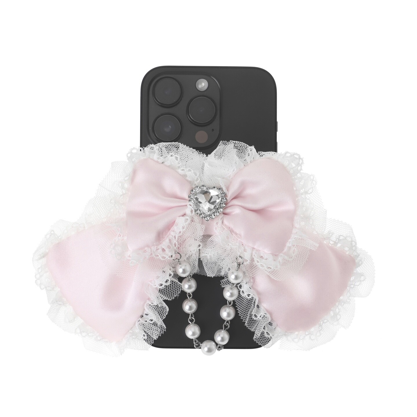 A satin ribbon with the new collection's signature crystal heart charm and a bold pearl chain.